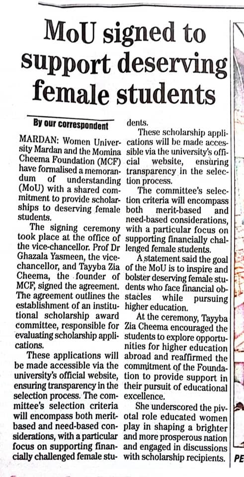 Momina Cheema Foundation was inaugurated in 2011 with its Law Scholars Program, in which we aspired to financially assist Female Students pursuing Law degrees in Pakistan. In the proceeding 2012-2013 academic session, we awarded scholarships to 23 bright students, helping them achieve their dream of pursuing Law Studies at leading Universities in Pakistan without being impeded by financial burdens or having to worry about Tuition Fees. Since the inaugural scholarships, we have expanded considerably and our list of Partner Institutions now include: